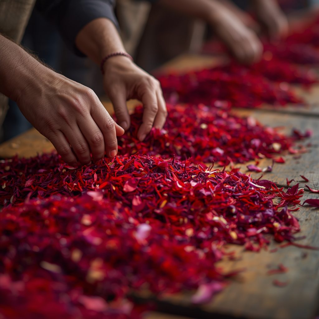 After the flowers are collected, they are taken to homes or small workshops. There, women and men sit together around large trays, gently separating the vivid red stigmas (the saffron threads) from the petals.