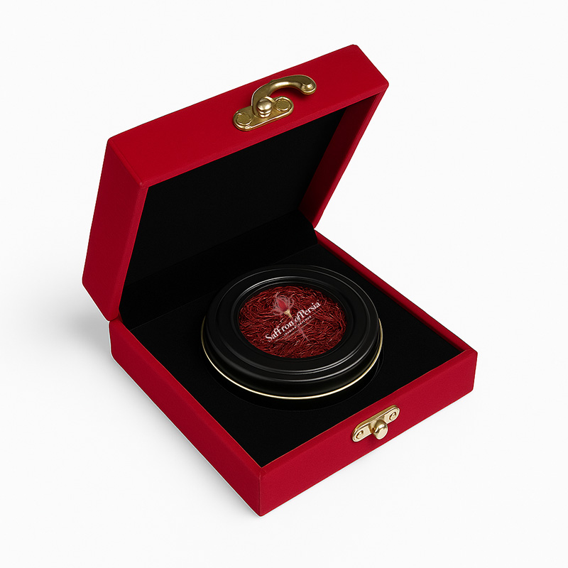 Indulge in 3 grams of Super Negin Saffron, presented in an intricately embossed metal box inside a luxurious red velvet case. This A++ grade saffron offers deep red threads with a captivating aroma that enhances every culinary creation. The embossed metal container protects the delicate saffron from light and moisture while preserving its freshness. Perfect for gourmet cooking, elegant dishes, or as a sophisticated gift, this saffron reflects the finest Persian craftsmanship. Each pinch brings a rich color, intense fragrance, and authentic flavor that elevates every dish to a culinary masterpiece.